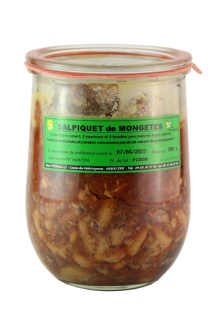 2 manchons canard, 2 saucissons et 2 boudins porc, haricots lingot, oignons, fond canard, tomate, ail, tomates concassées, persil, sel naturel de Gruissan, poivre