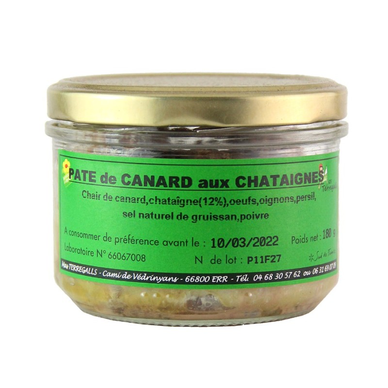 Chair de canard, chataignes 12%, oeufs, oignons, persil, sel, poivre