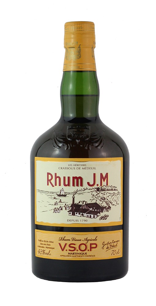 En 1914, Gustave Crassous de Médeuil rachète la Rhumerie J.M à la famille de Jean-Marie MARTIN. Depuis cette date, les héritiers Crassous de Médeuil veillent consciencieusement à la production de Rhum J.M. Cultivées et sélectionnées par nos soins, nos cannes à sucre sont broyées dans nos moulins moins d'une heure après la coupe, cette spécificité permet de garantir l'obtention d'un jus de canne particulièrement frais et riche en arômes. Nos fûts sont soigneusement sélectionnés et préalablement brûlés avant leur utilisation. Chaque année, notre maître de chais procède à un ouillage méticuleux des fûts avec des Rhums de mêmes comptes d'âge afin de préserver la typicité propre à chaque millésime. La lente alchimie du bois et de l'alcool confère à nos Rhums vieux leurs lettres de noblesse : Une couleur dorée naturelle et une large palette aromatique.