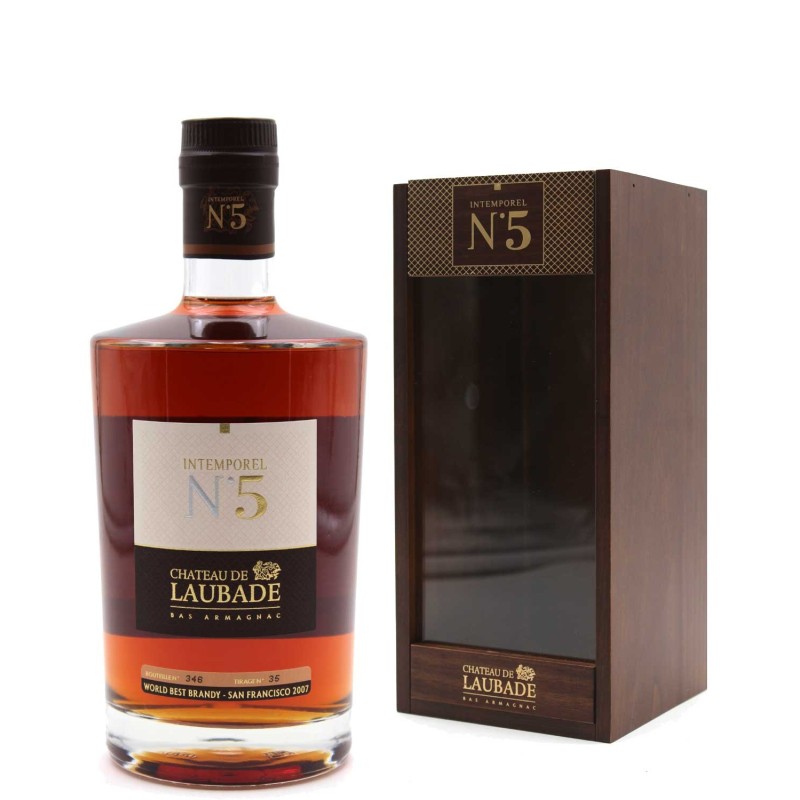 «Cet assemblage de teinte acajou est un bas armagnac de grande maturité avec une forte présence de Baco. Au nez, l’Intemporel N°5 est très riche avec des arômes de pruneau, fruits confits, cacao, torréfaction, figue, noisette, fruits mûrs. En bouche il est souple et boisé, riche avec un finale exceptionnelle.