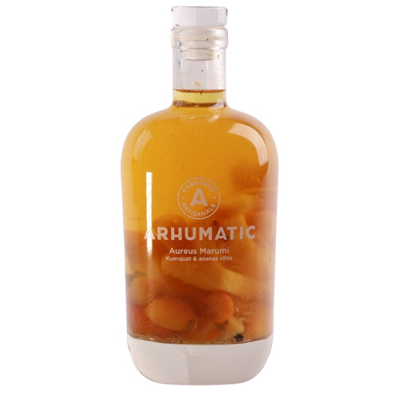 Aureus Marumi est un rhum arrangé issu d’une macération 100 % naturelle mêlant du kumquat frais et de l’ananas soigneusement rôti au four avant d’être plongé dans le rhum.