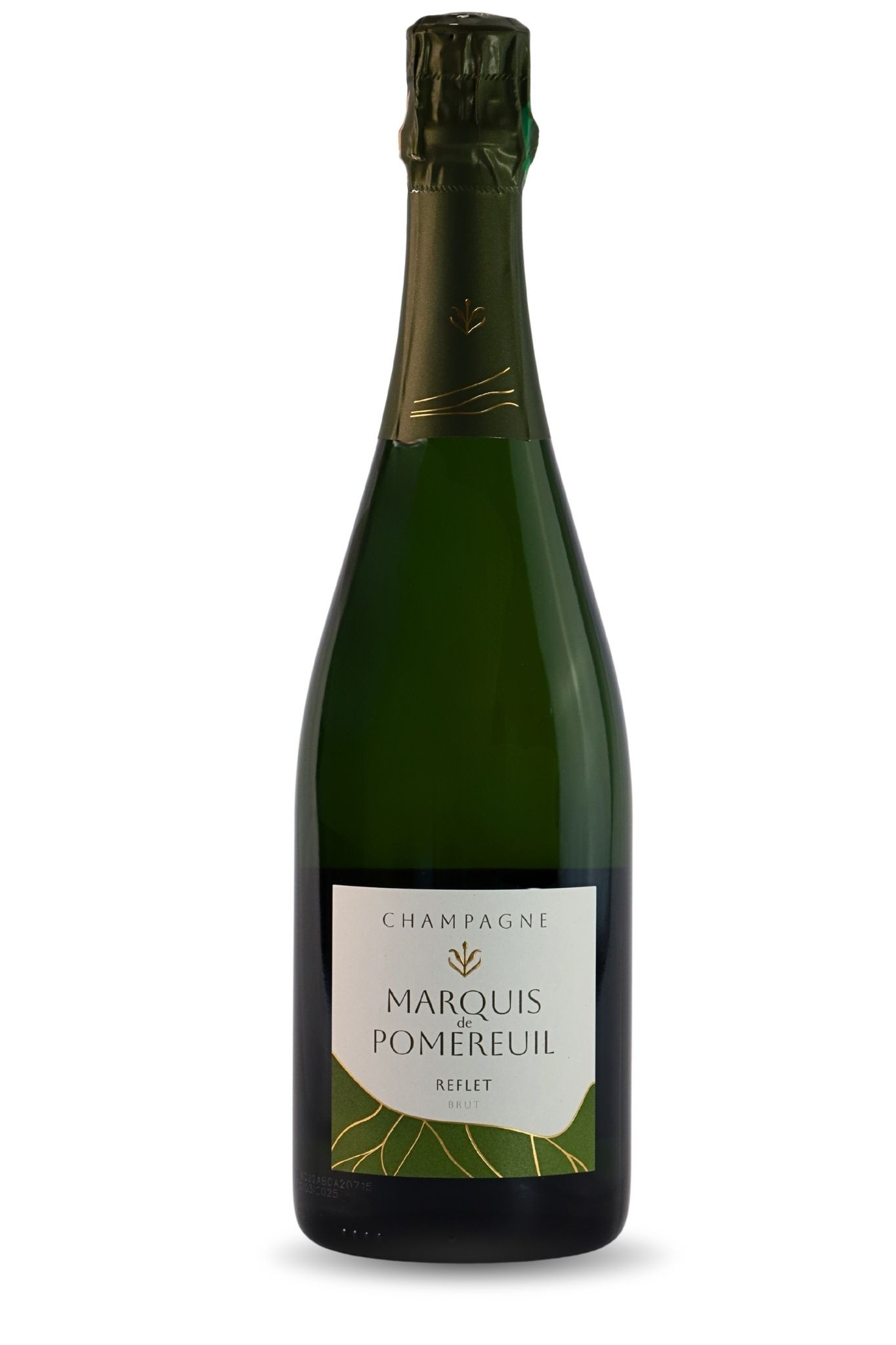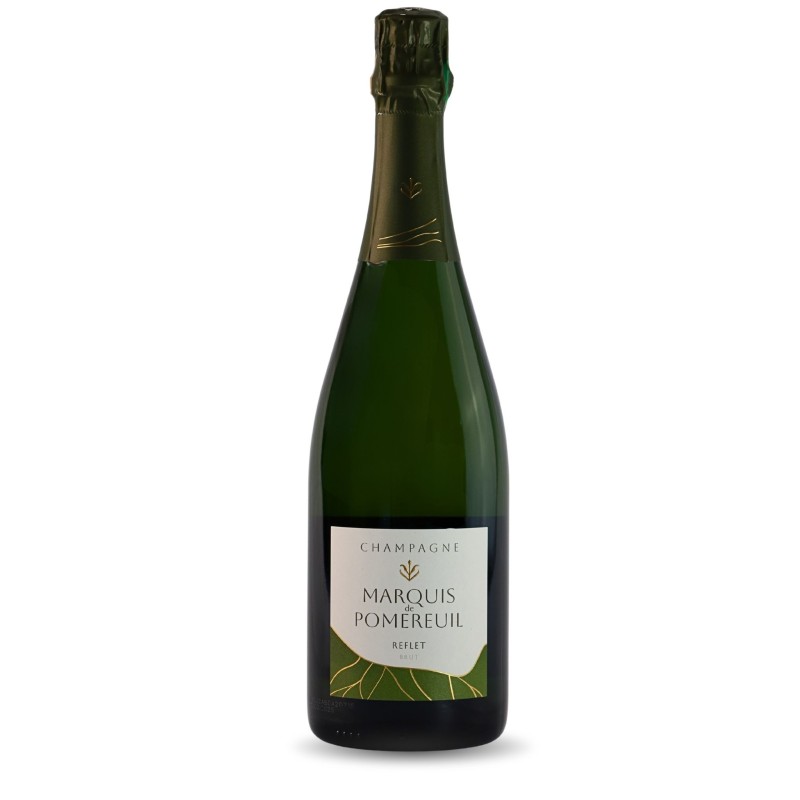 Le Reflet Brut du Marquis de Pomereuil s’ouvre sur une robe limpide et lumineuse, animée d’une fine effervescence qui annonce un champagne précis et raffiné.