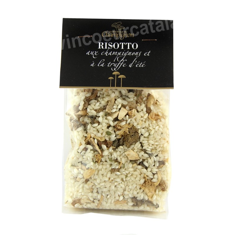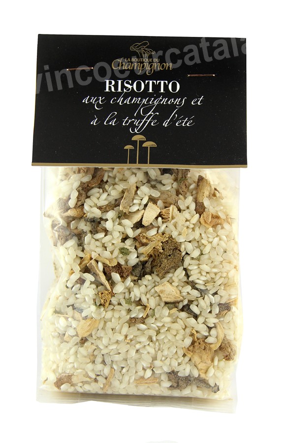 Ingrédients : Riz, mélange de champignons séchés (cèpes, petits mousserons, girolles, trompettes, shiitakés) 5%, truffe d'été (Tuber aestivum) 2%, bouillon de légumes, oignon, ail, romarin, persil et arôme de truffe noire.