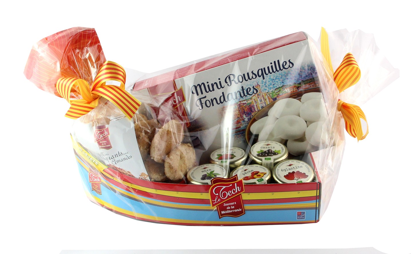 La confiserie du Tech présente la barque catalane, une idée de cadeau originale qui reprend haut et fort nos belles couleurs et traditions catalanes. Des rousquilles comme on les aime, des croquants catalans, et des petits pots de confiture à la mûre, à la fraise, à la rhubarbe, à la myrtille et à l'églantine. De quoi se régaler au petit déjeuner.