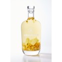 à l'Oeil la pulpe du fruit de la passion se disperse dans l'ensemble du flacon, les grains les plus charnus se sont déposés au fond de la bouteille enrobant les lamelles de gingembre.